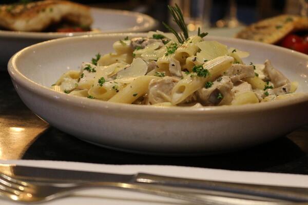 - chicken pesto rigatoni (chicken, porcini mushrooms, red onions, parmesan cheese with penne, bechamel, basil & pine kernel pesto)